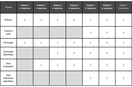 1) S'inscrire aux séances "Objectifs Galops", pour bénéficier d'un accompagnement personnalisé, et passer ainsi son Galop en contrôle continu. Chaque module effectué sera notifié et validé sur votre Carte Galop qui vous sera remise à l'occasion de la première séance (théorie ou pratique), et vous permettra de comprendre et de suivre votre progression au rythme du tableau ci-dessous.